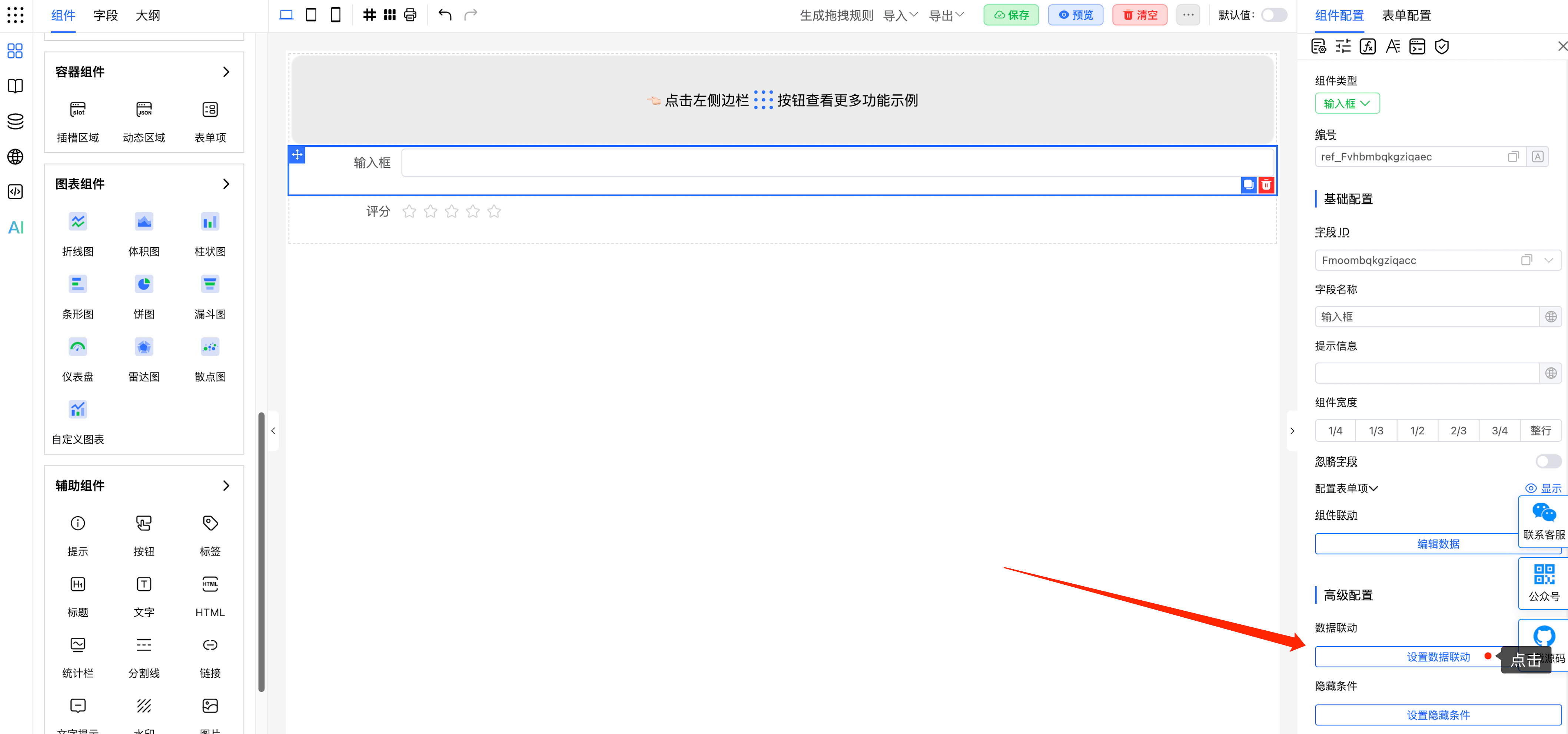 支持设置「数据联动」的字段包括:输入框、多行输入框、密码输入框、提及、分段控制器、数字输入框、单选框、多选框、选择器、开关、评分、时间、时间区间、滑块、日期、日期区间、颜色选择器、级联选择器、上传、穿梭框、树形控件、树形选择、省市区选择器、富文本框、唯一值、手写签名、计算公式、子表单选择器、插槽区域、动态区域