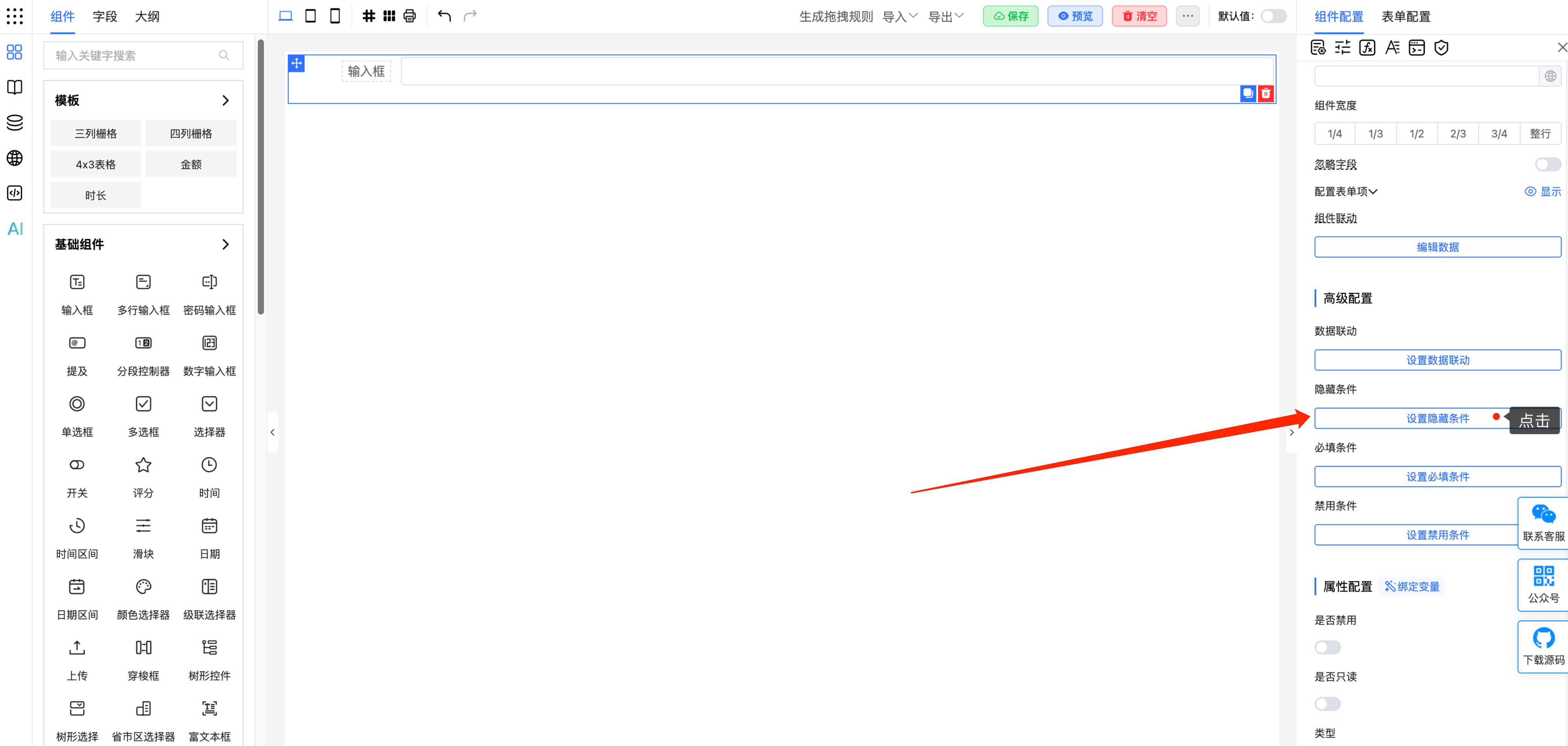 对于以下字段,选中字段后,均在「组件配置 >> 高级配置」处设置「隐藏条件」: