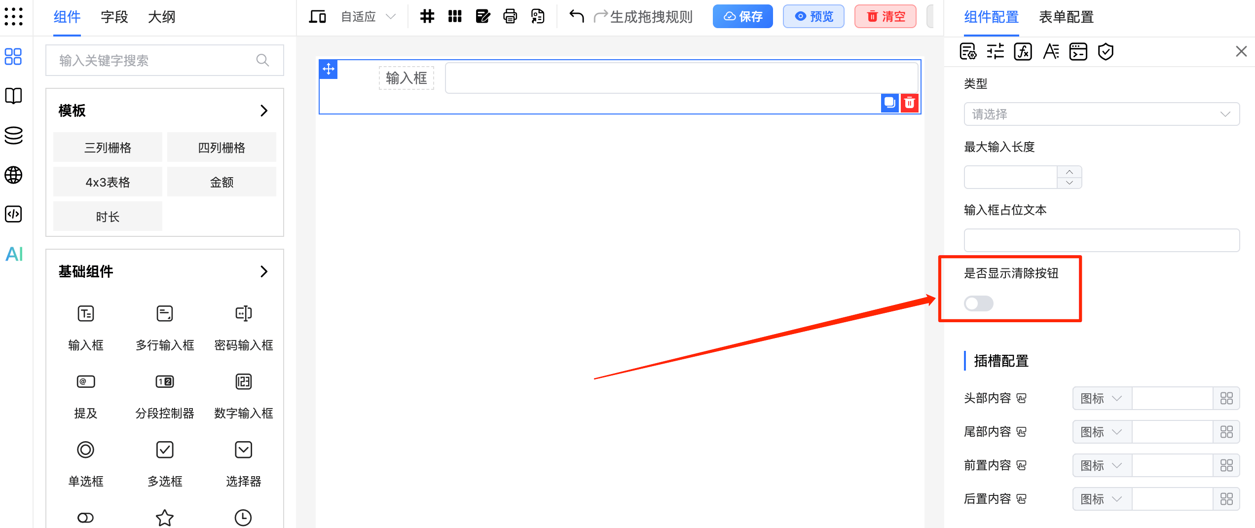 清除按钮展示隐藏,在「组件配置 >> 属性配置」处设置: