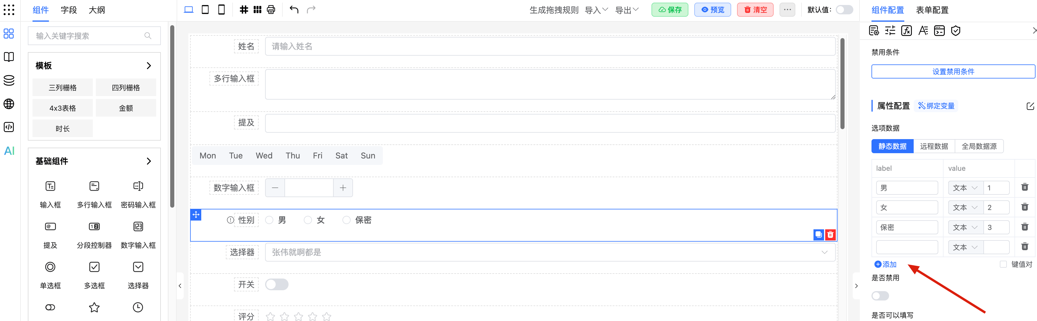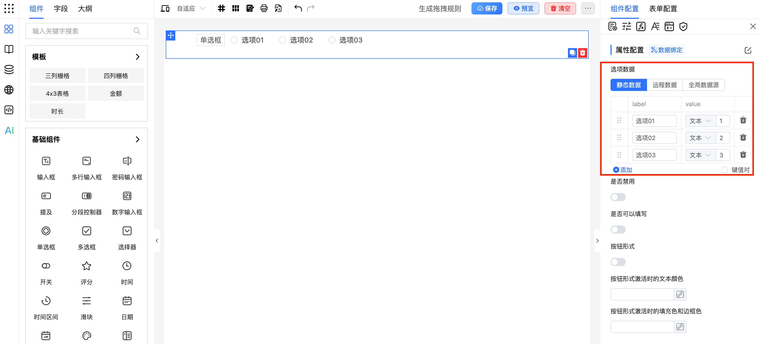 自定义表单中选项数据支持静态数据、远程数据、全局数据源设置,在「组件配置 >> 属性配置」处设置: