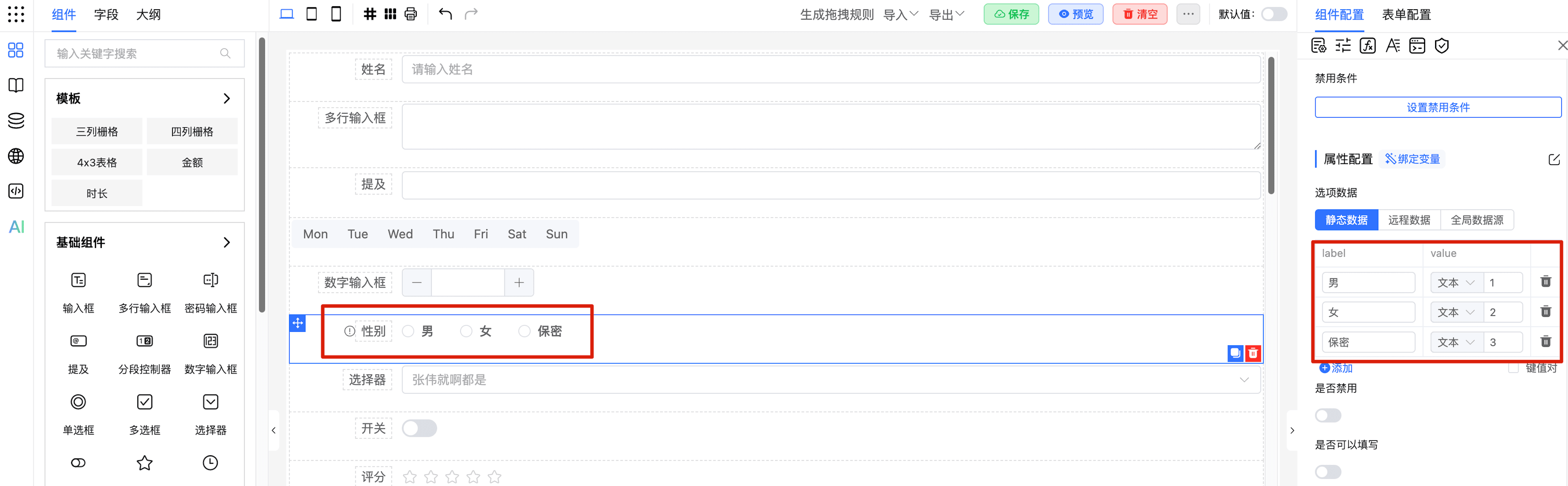 以性别为例,需要男、女、保密三个选项时可以直接在选项数据中维护