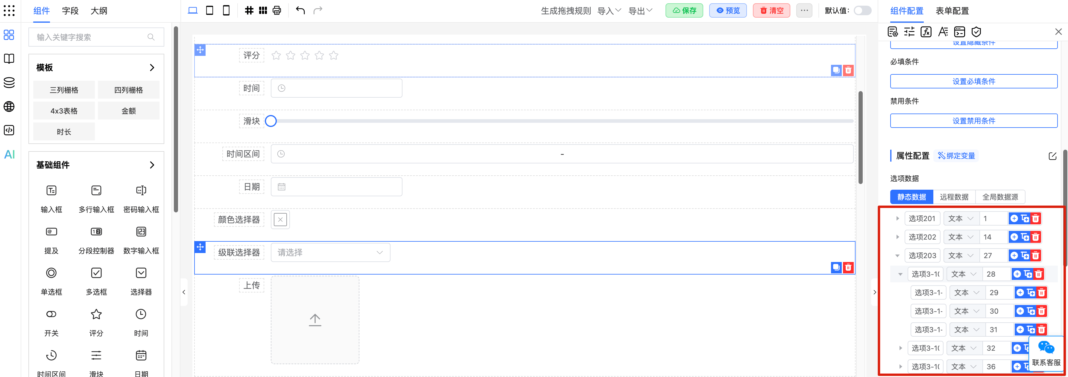 级联类型的选项支持添加多级选项数据,按钮依次是新增同级选项、新增子级选项、删除本选项