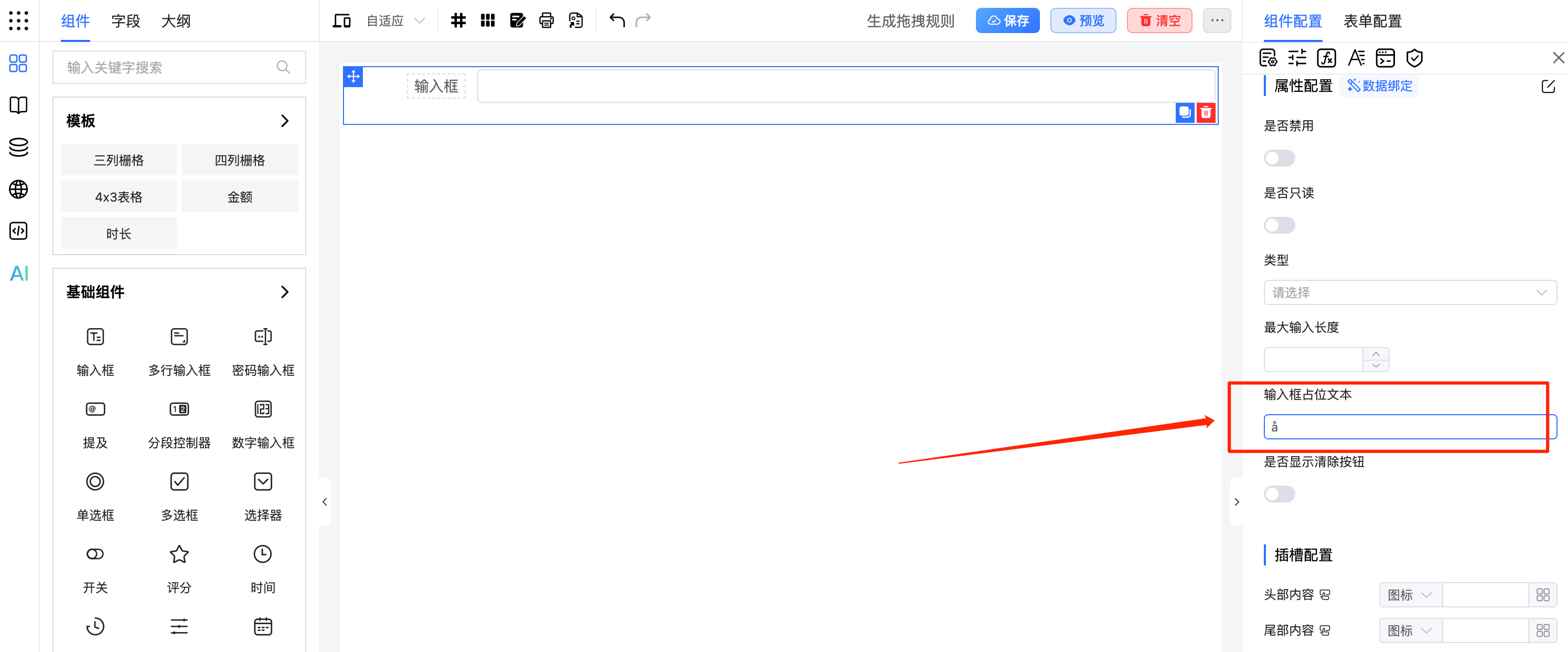 自定义输入框占位文本,在「组件配置 >> 属性配置」处设置: