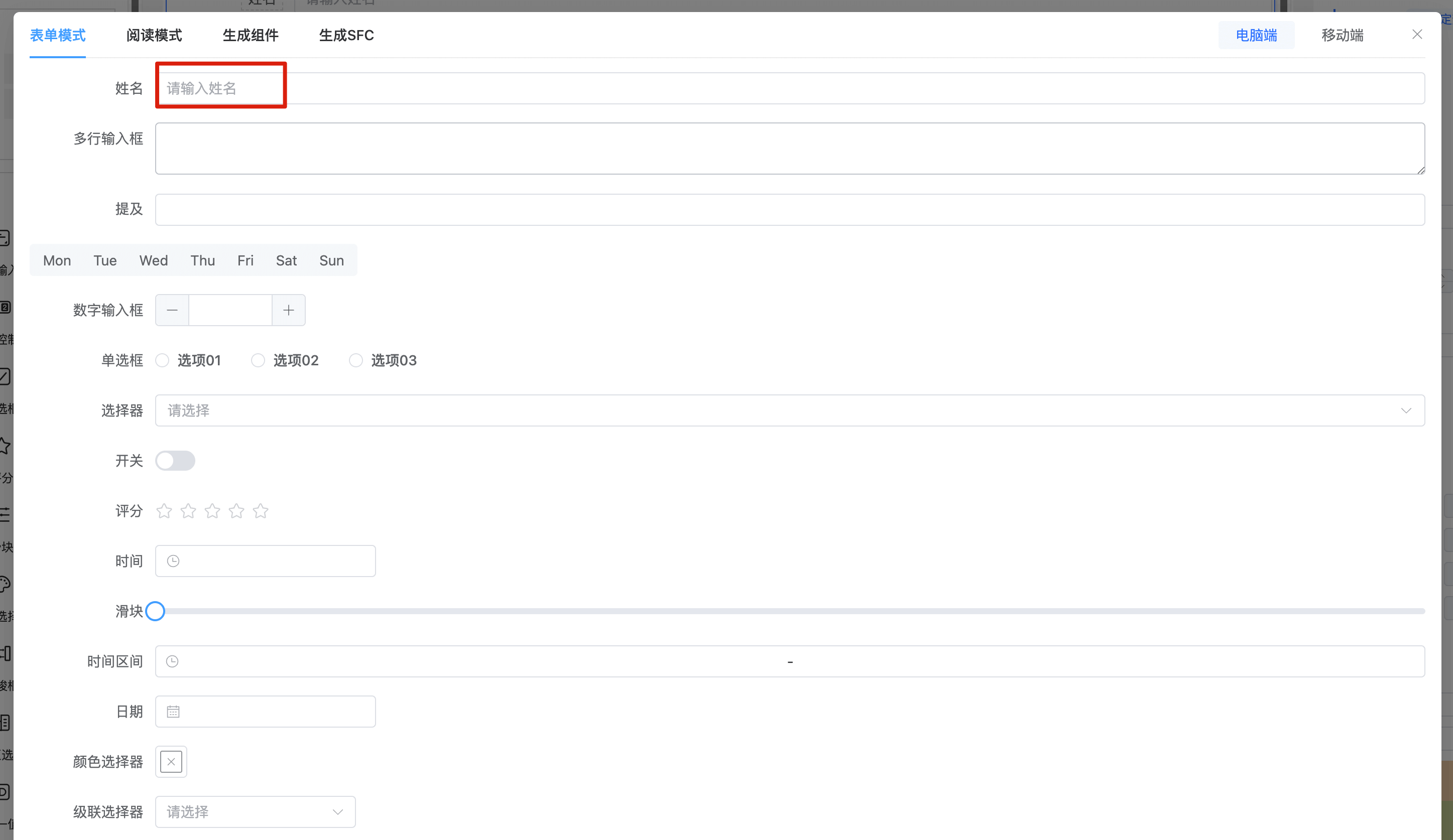 文本框、多行输入框、提及、数字输入框、选择器、时间、时间区间、日期、级联选择器、树形选择、省市区选择器、富文本框、子表单选择器。