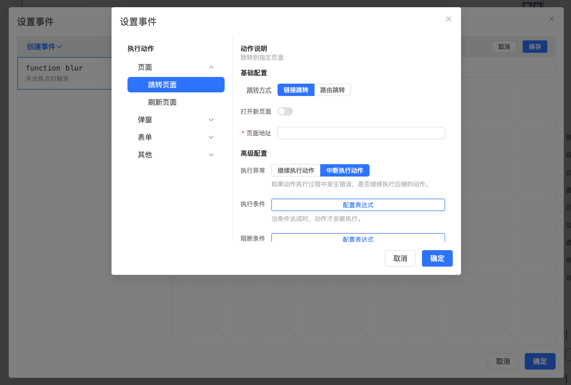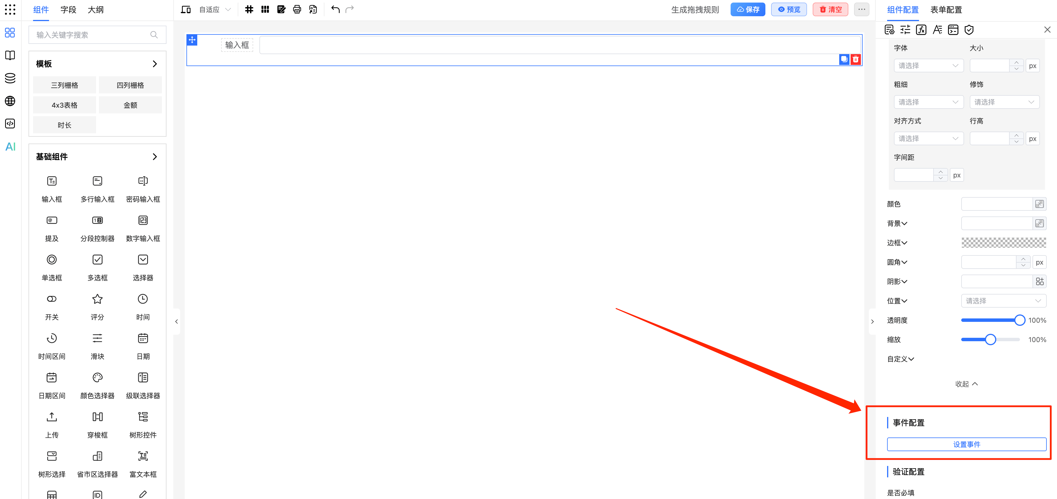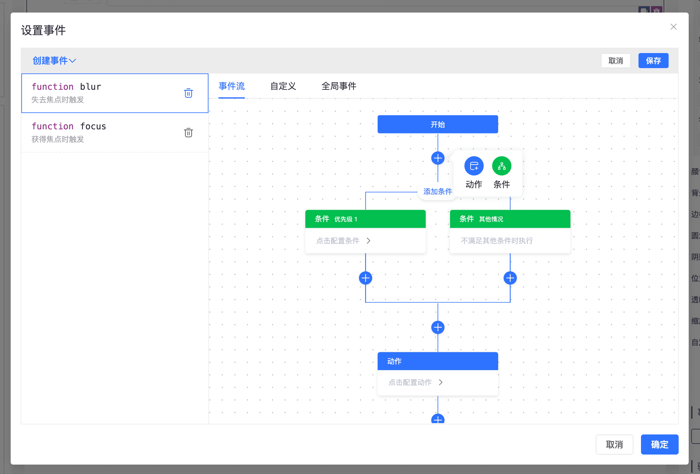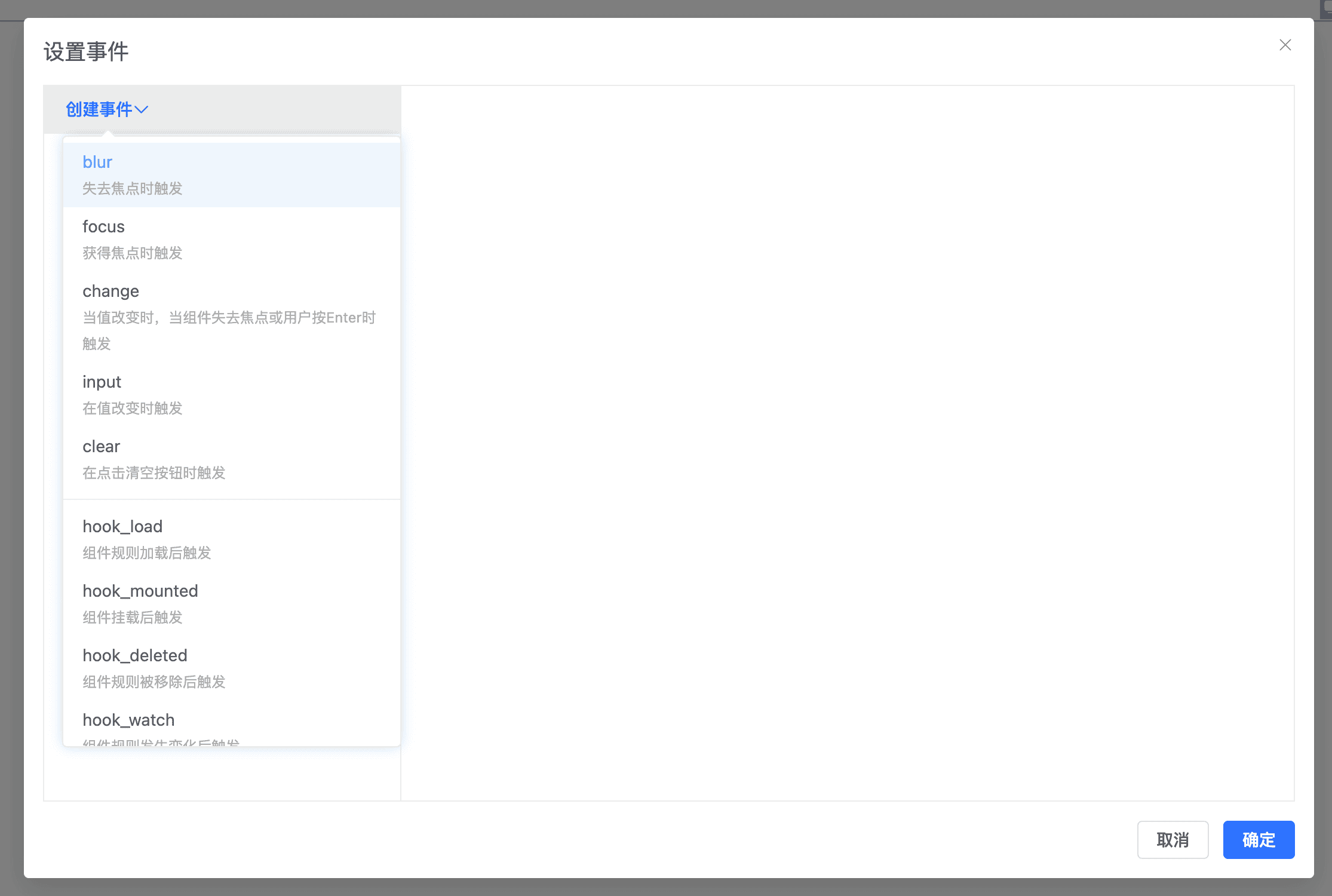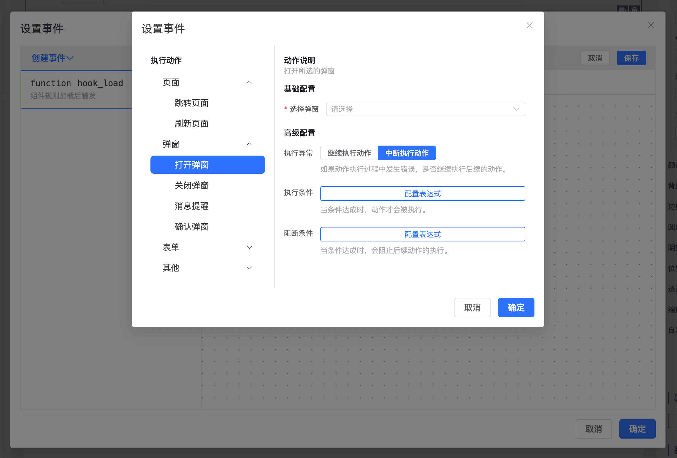 组件事件配置用于监听和处理组件交互过程中的各类事件,以实现更灵活的联动逻辑和业务行为。