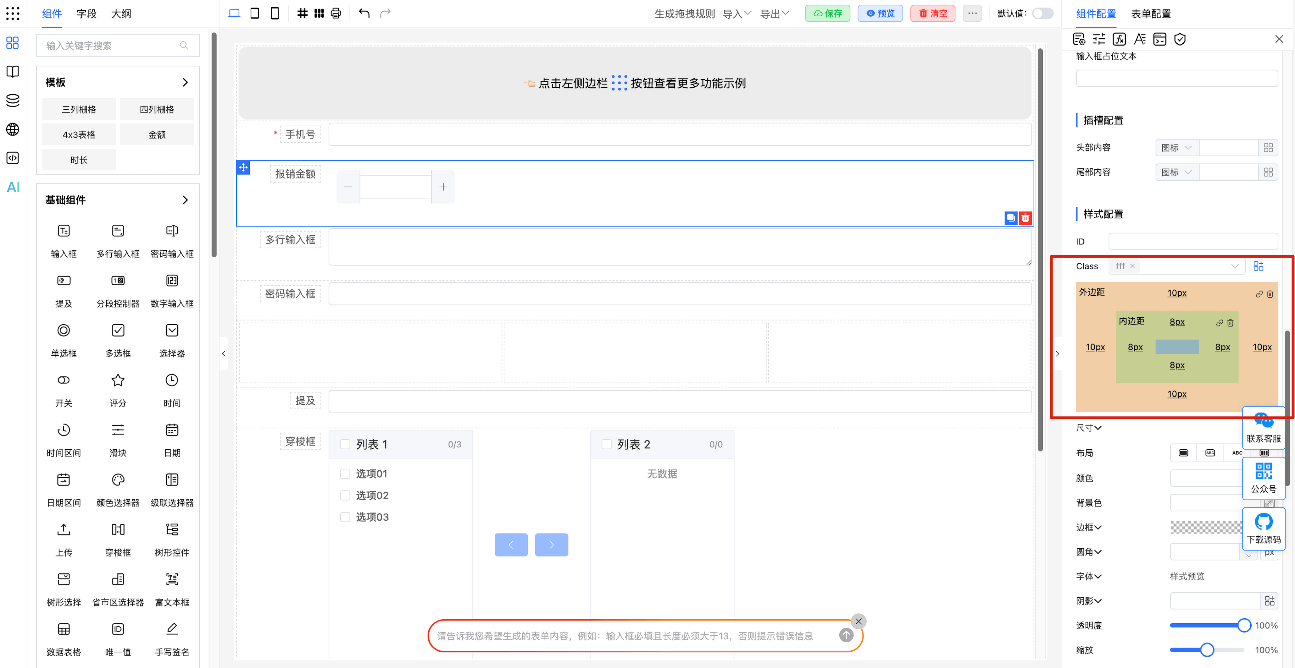 支持设置class全局样式,统一撰写组件样式之后,可在多个组件中进行使用。对于企业统一主题、品牌色、公共按钮样式这类会被多表单复用的内容,建议优先沉淀为全局样式,后续维护会更轻松。