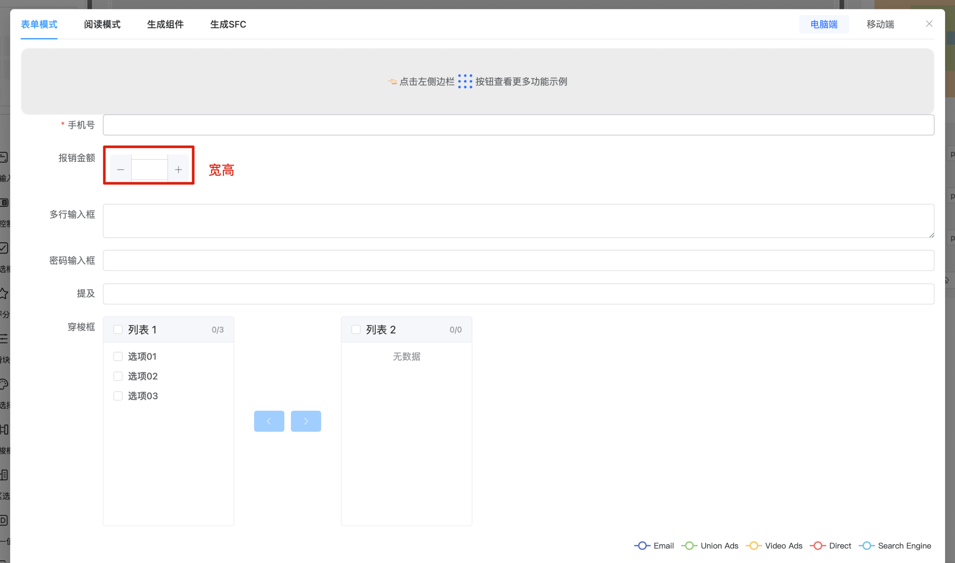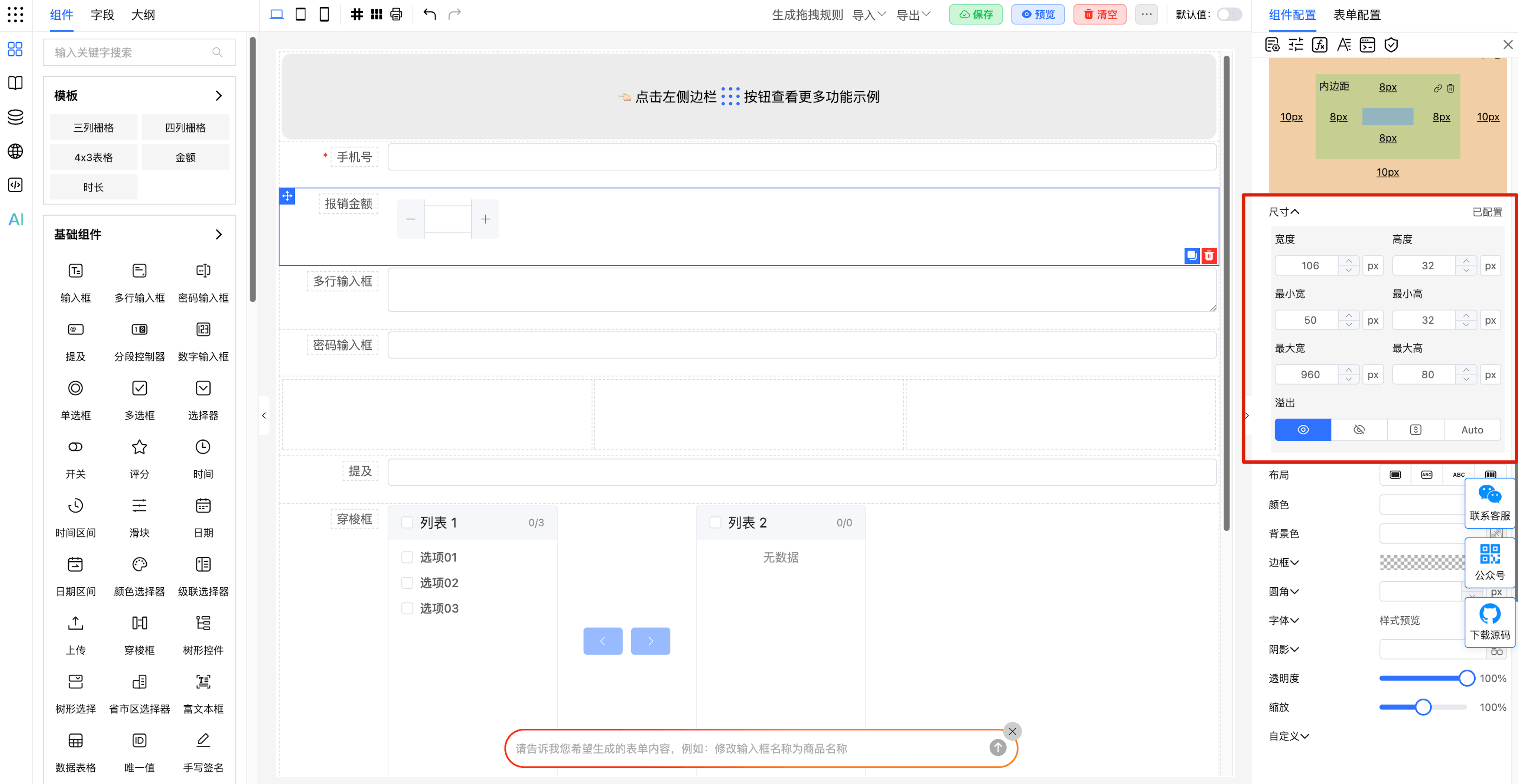 支持用户自定义设置字段组件的宽度、高度,及溢出时的处理方式。
