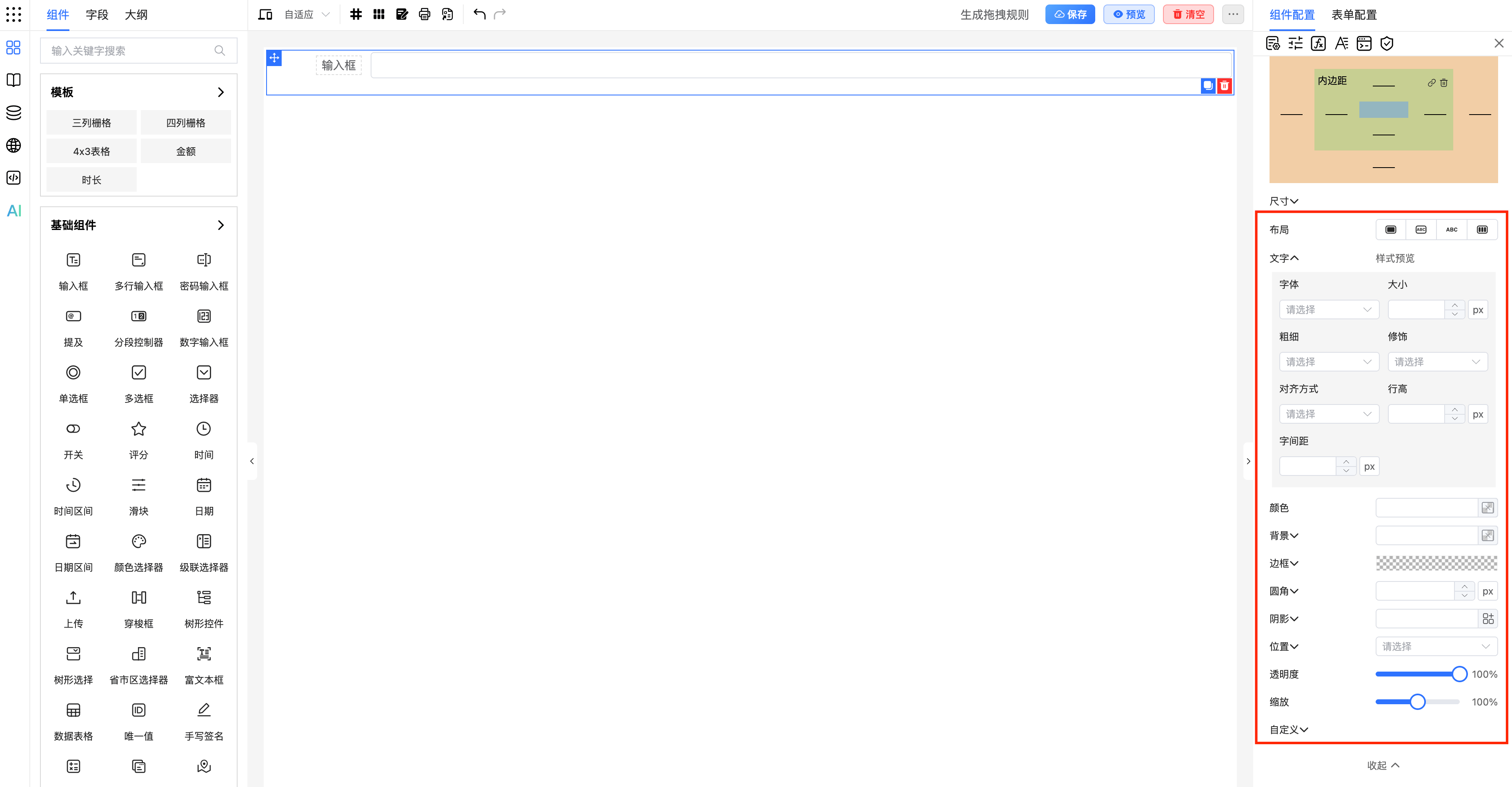 支持用户自定义设置组件的布局、颜色、背景色、边框、圆角、字体、阴影、透明度、缩放等。若某些样式需要跟随业务状态动态切换,也可以在事件中结合表单 API修改规则或类名,实现运行时样式联动。