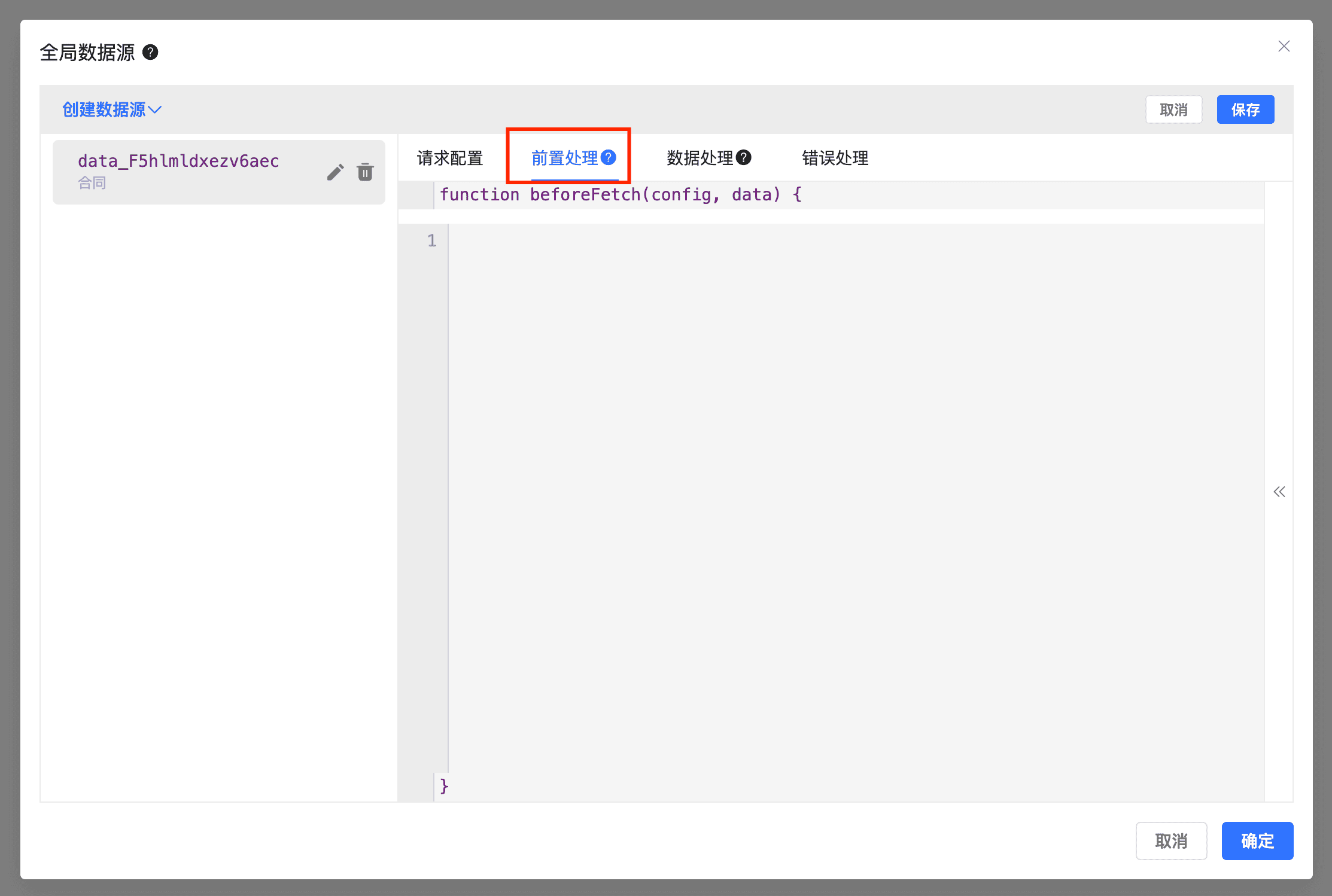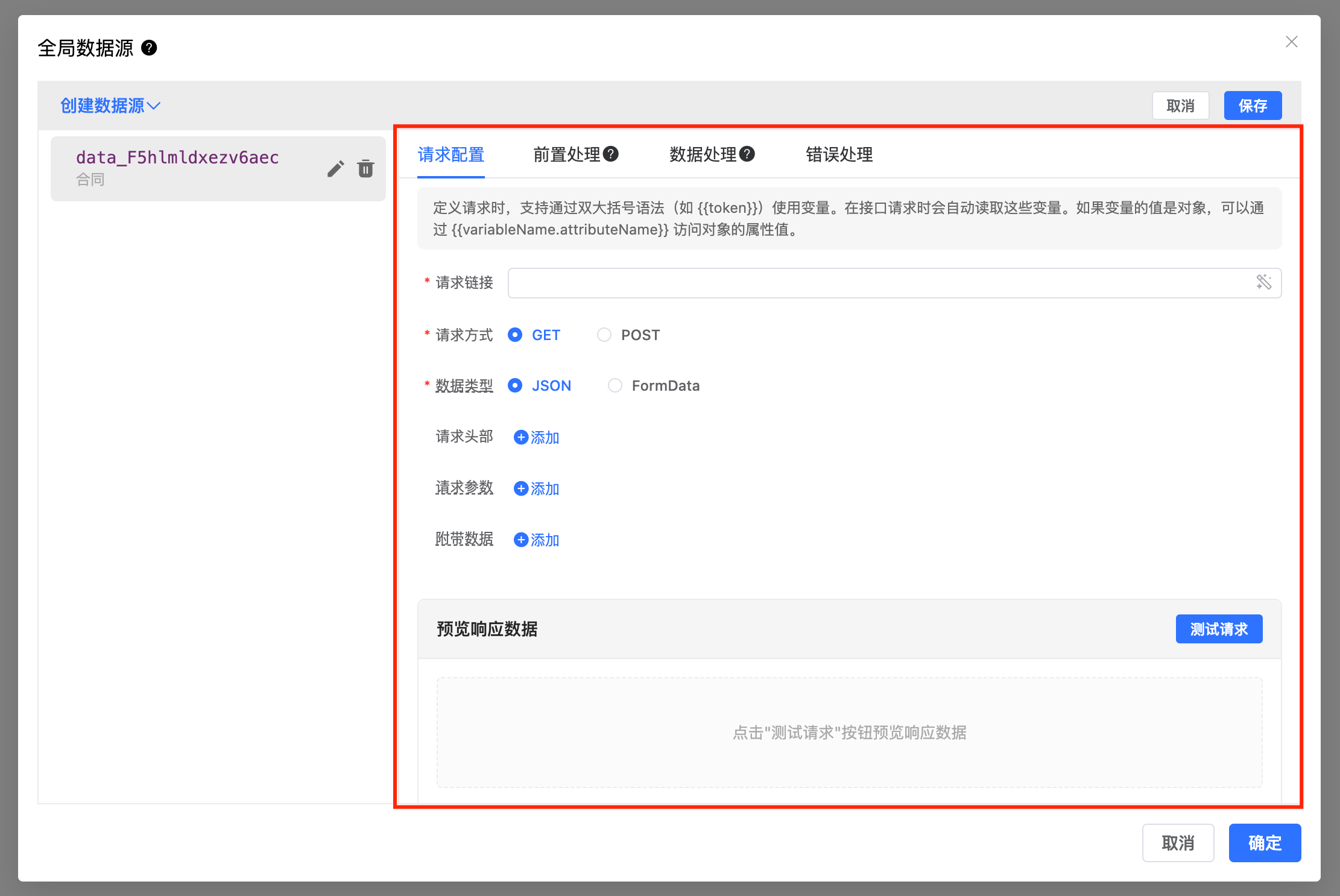 用于配置远程数据的请求链接、请求方式等信息;如果你想进一步了解请求结构、请求头、变量替换或 beforeFetch 的处理方式,可以继续查看远程请求。