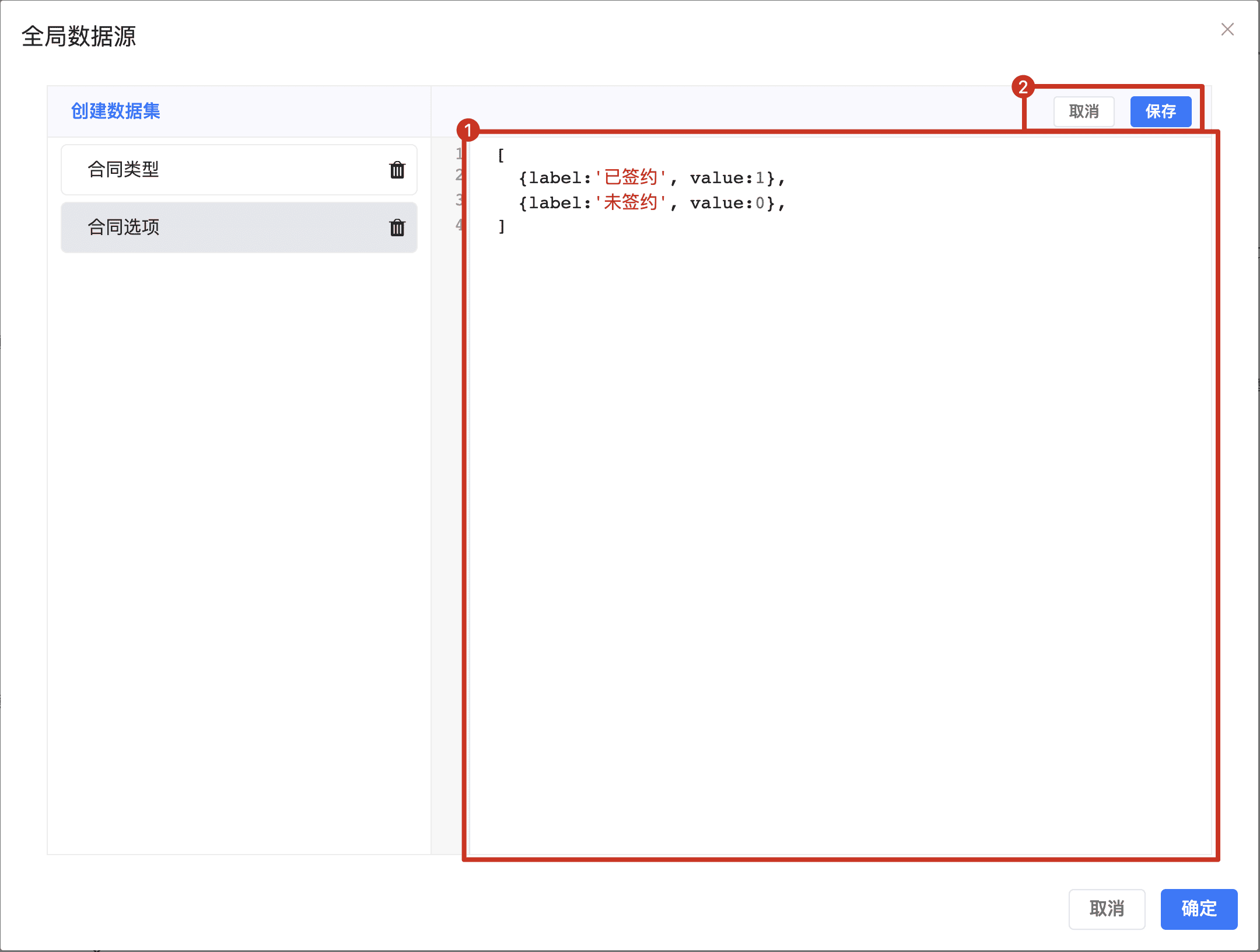 除了新增数据源外,日常维护中还会涉及数据集的删除、重命名、扩展字段和刷新加载。对于多个表单共用的选项配置,建议优先使用全局数据源统一维护,这样既能减少重复配置,也更方便开发者统一调整接口和数据格式。