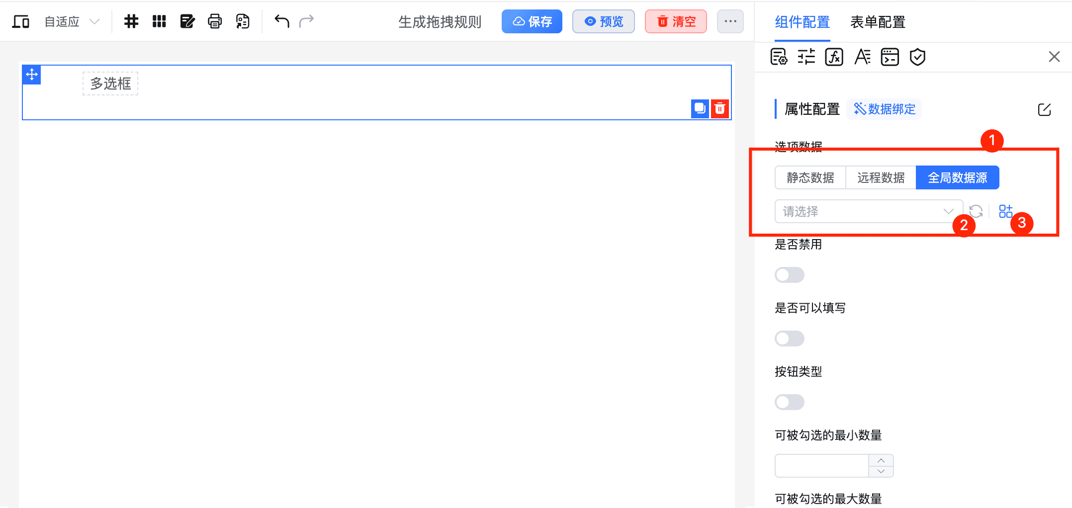 全局数据源通常用于 checkbox、radio、select、级联选择器等选项类组件。配置完成后,可在对应组件的选项数据配置区域直接选择全局数据源;如果你希望从开发侧批量导入或预置全局数据,也可以继续查看预定义全局数据。