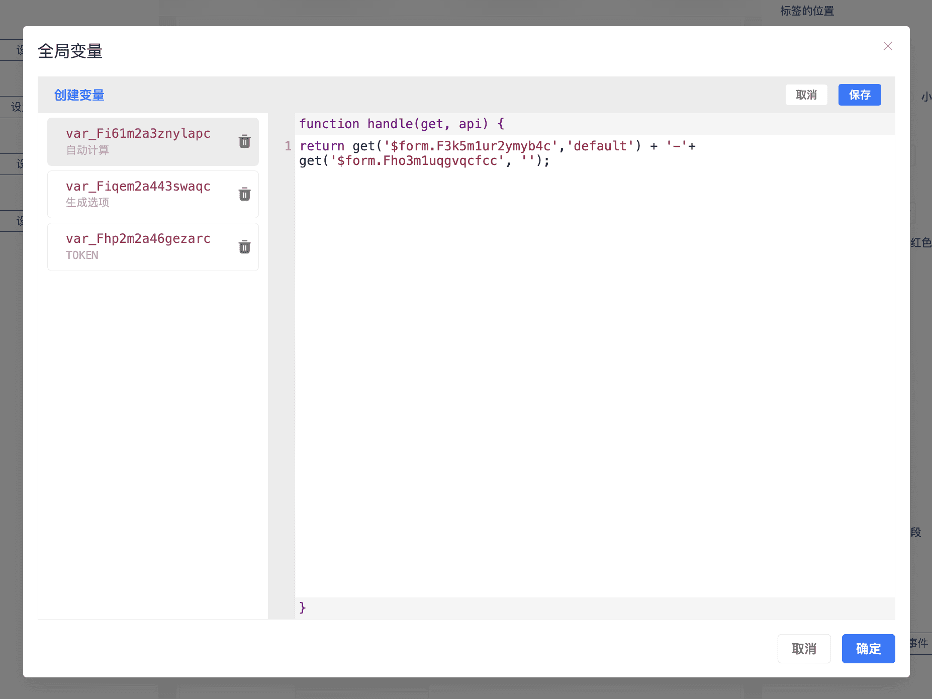用户可以定义全局变量,统一管理和存储需要在表单中使用的动态值