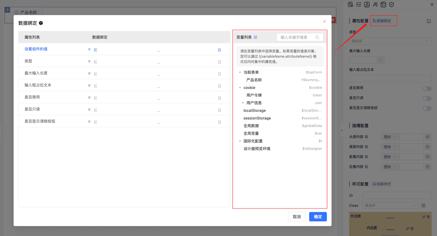 配置好全局变量后,可在组件属性配置中直接读取变量值,用于设置默认值、控制显示内容、切换占位文本或参与公式与事件逻辑;若变量值需要在运行时被代码主动覆盖或更新,也可以参考操作全局数据中的 setGlobalVar、getData 等方法。